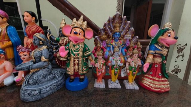 Each year, Bombe Mane creates a special display of dolls which is not for sale and is tied to a particular theme or occasion. This year the triple chariots of Lord Jagannatha, Balabhadra and Subhadra have been recreated in a manner that is totally magnificent. This display called “Jagadoddharaka” is indeed a treat for the eyes.