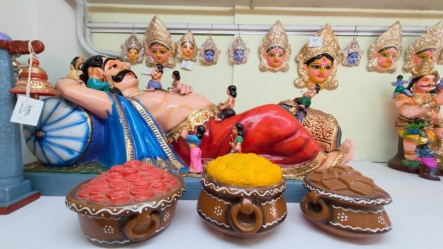 The store which has thousands of dolls also holds an annual sale during Navratri and this year is the 19th edition of the display cum sale. Dolls are available from all over India and are specially manufactured by the best of the artists. Materials range from wood to clay and doll clusters like Varanasi, Channapatna, Kinnal and Kondepalli make an appearance. From idols of Gods and Goddesses to animals, birds and human figurines as well as some quirky creations, you can find them all here.
